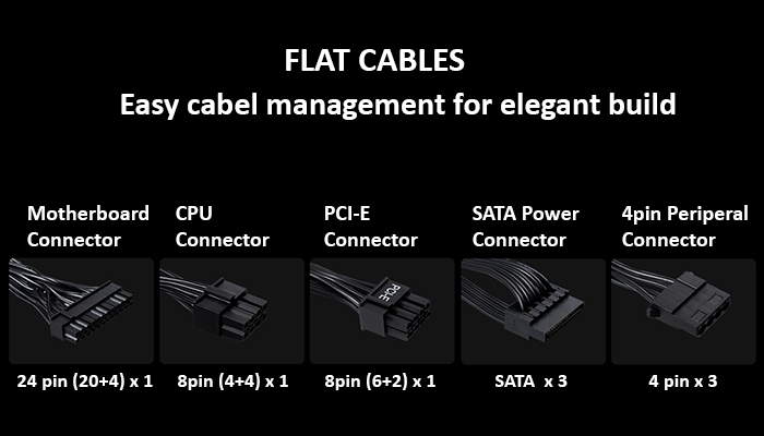 - - All cables made with flexible flat arrays Super Black 4 มาพร้อม สายไฟที่ถูกห่อหุ้มด้วย Flat arrays ช่วยให้การจัดเก็บสายไฟภายในเคสทำได้ง่าย ดูสวยงาม เป็นระเบียบเรียบร้อย และไม่ไปบดบังทิศทางการไหลเวียนของอากาศภายในเคส