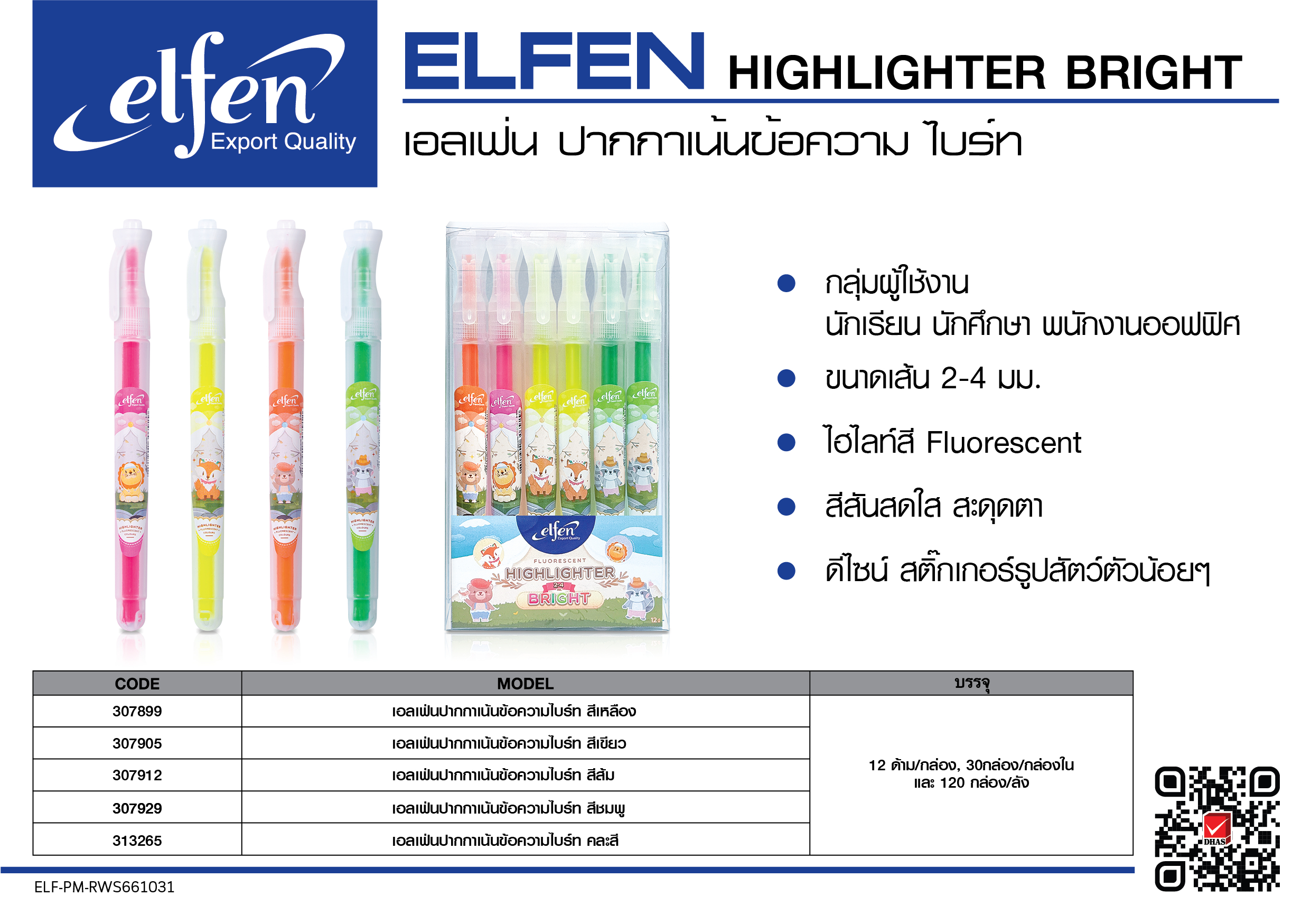 ปากกาเน้นข้อความ Elfen Bright ให้การเน้นที่โดดเด่นด้วยหมึกสีเหลืองสดใสไม่ซีดจาง แม้ใช้งานเป็นเวลานาน หัวปากกาแข็งแรงทนทาน เหมาะสำหรับการใช้งานในเอกสารหรือการเรียนรู้ ช่วยให้สามารถเน้นข้อความสำคัญได้อย่างชัดเจนและสะดวกสบาย