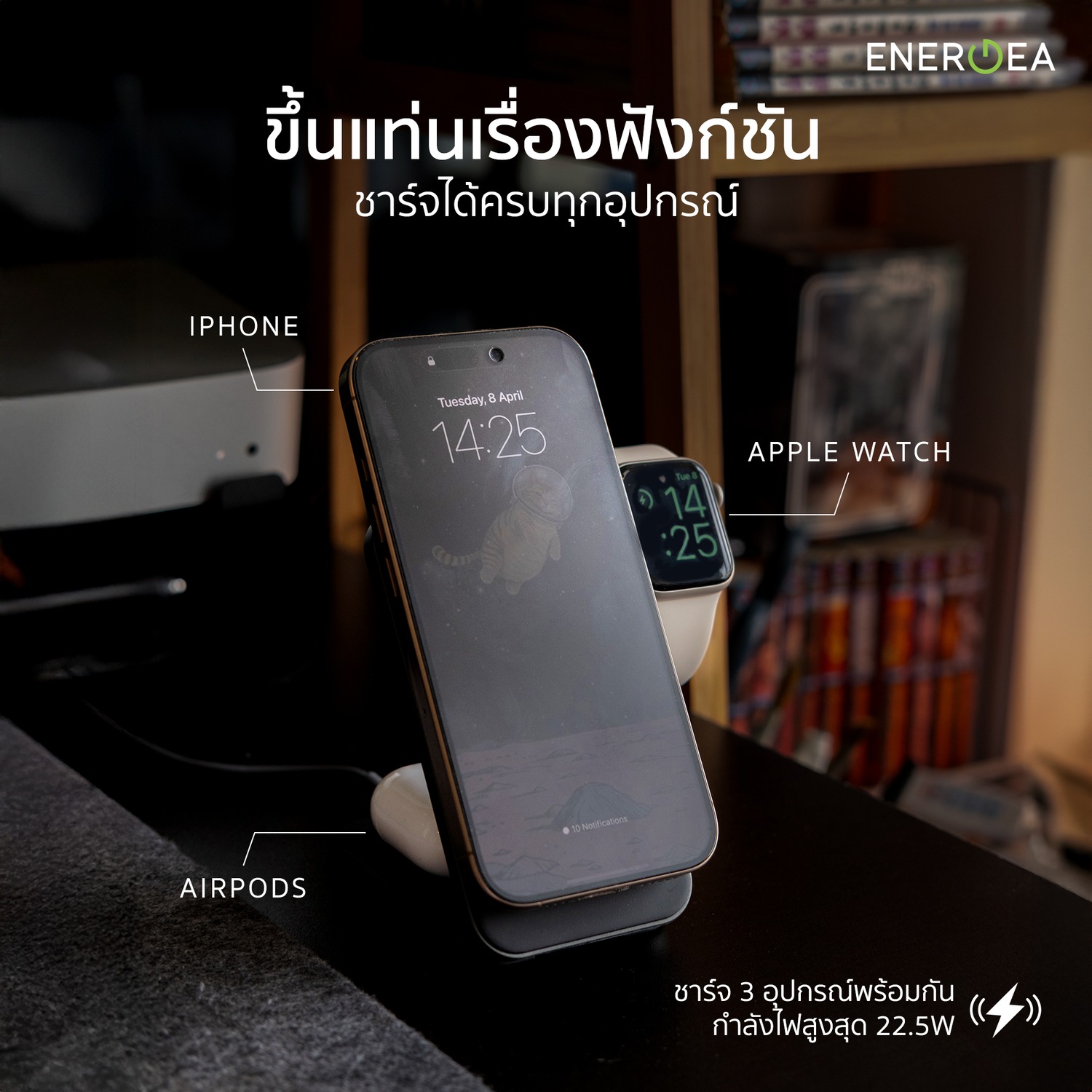 - - ชาร์จไร้สายได้ 3 อุปกรณ์พร้อมกันทั้ง iPhone, AirPods และ Apple Watch ด้วยกำลังไฟสูงสุด 22.5W