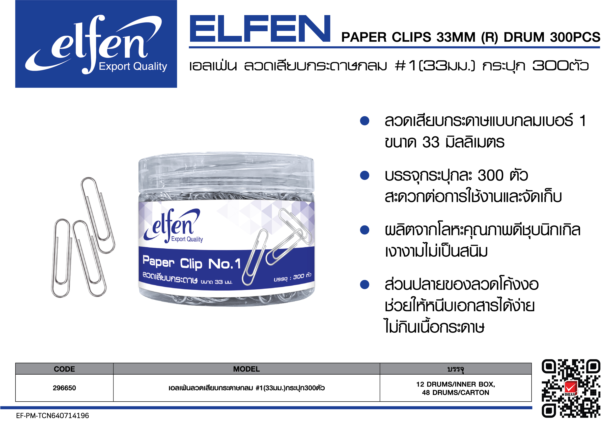 - - เอลเฟ่น ลวดเสียบกระดาษแบบกลม ขนาด 33 มม. กระปุก 300 ตัว