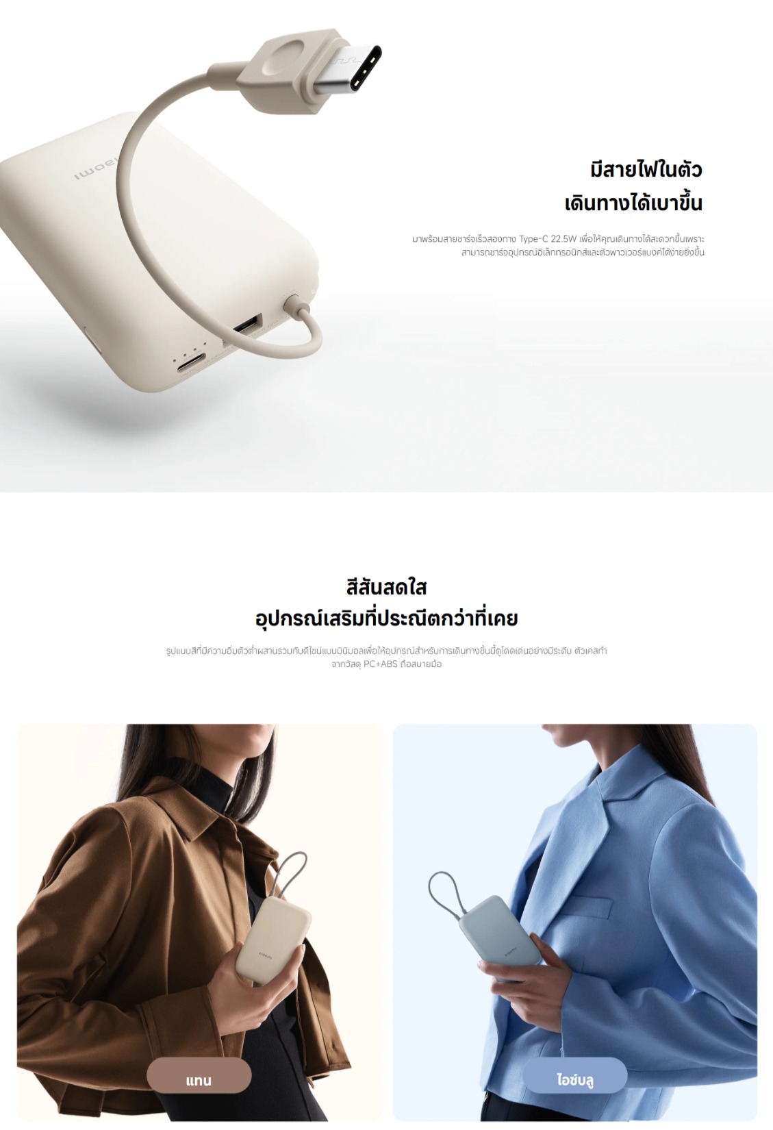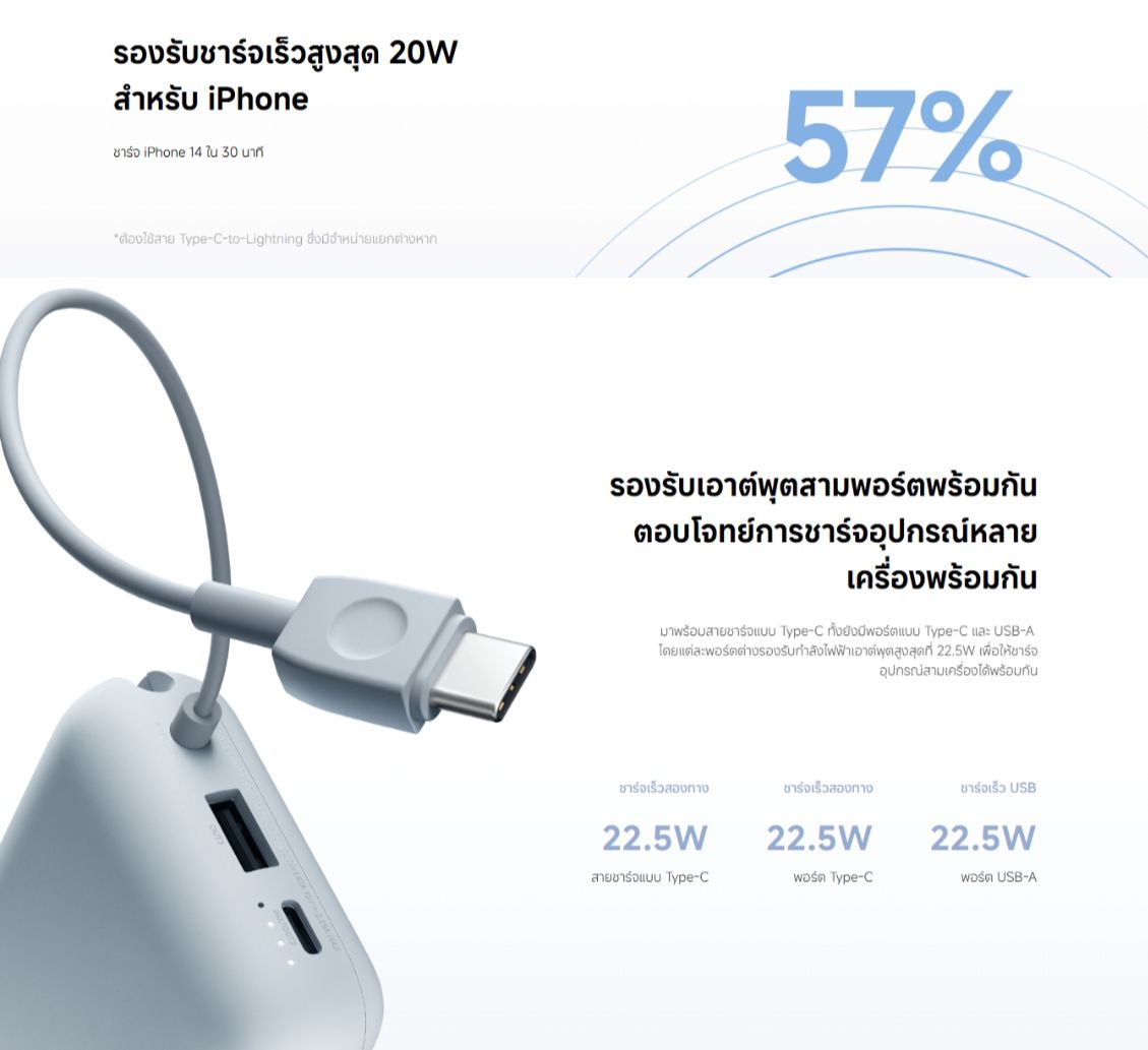 - - มีสายไฟในตัว มาพร้อมสายชาร์จเร็วสองทาง Type-C 22.5W ทำให้การเดินทางของคุณสะดวกยิ่งขึ้น