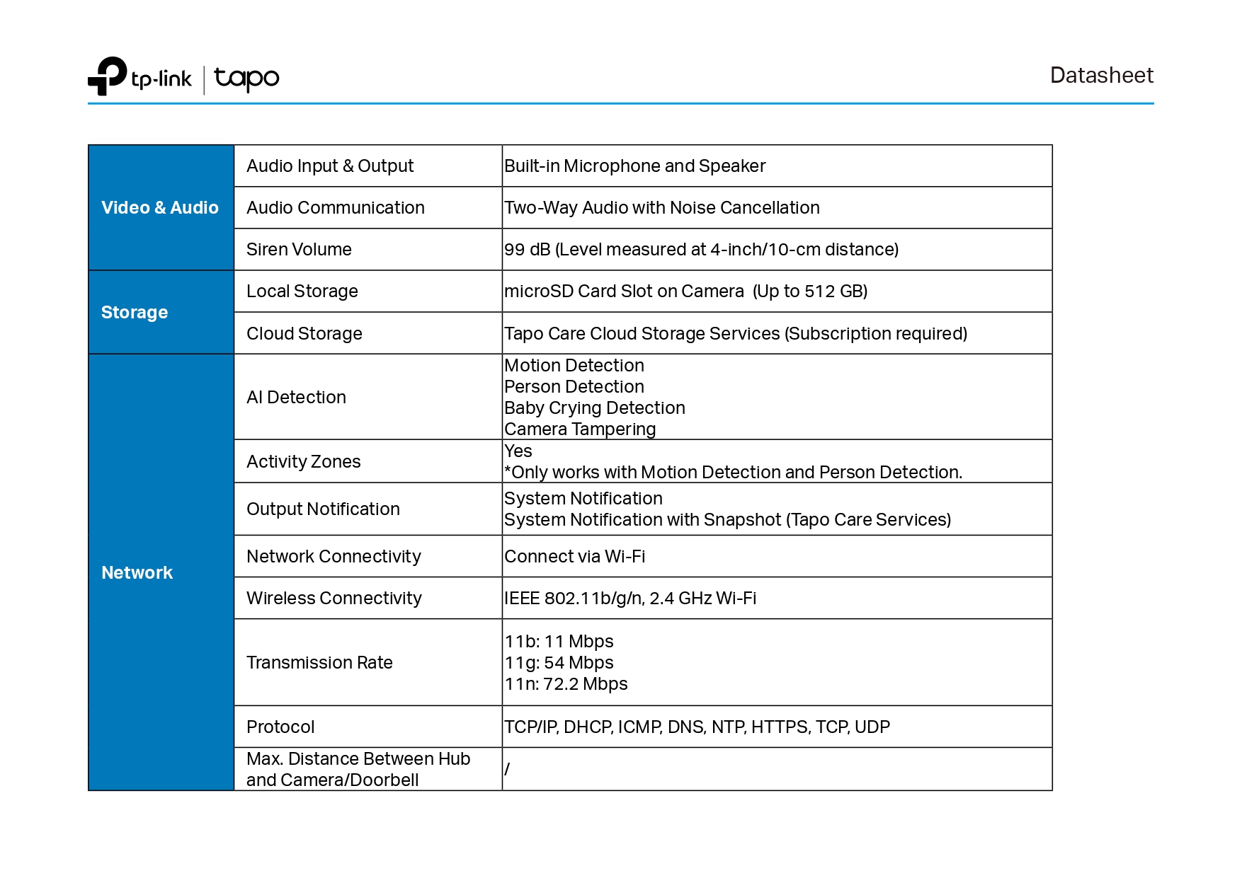 - - Local and Cloud Storage : บันทึกวิดีโอที่บันทึกไปยังการ์ด microSD (สูงสุด 512 GB) หรือโดยใช้บริการจัดเก็บข้อมูลบนคลาวด์ Tapo Care