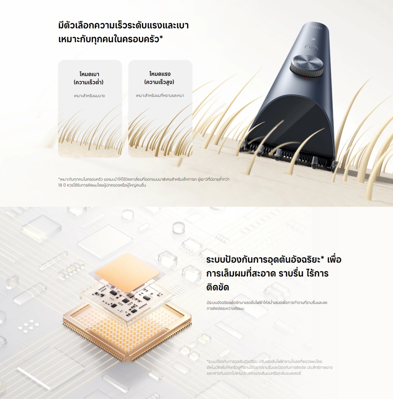 - - มีโหมดอ่อนโยน (สำหรับเด็ก/ผมเส้นเล็ก) และโหมดทรงพลัง (สำหรับผมหนา) เพื่อตอบโจทย์ทุกการใช้งาน