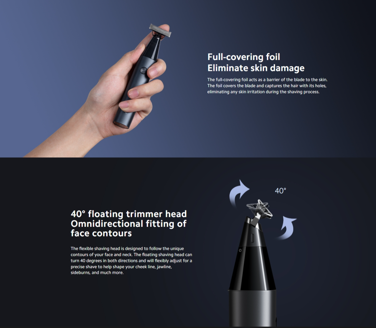 - - หัวตัดแต่งทรงผมแบบลอยตัว 40° ปรับเข้ากับรูปทรงใบหน้าได้รอบทิศทาง