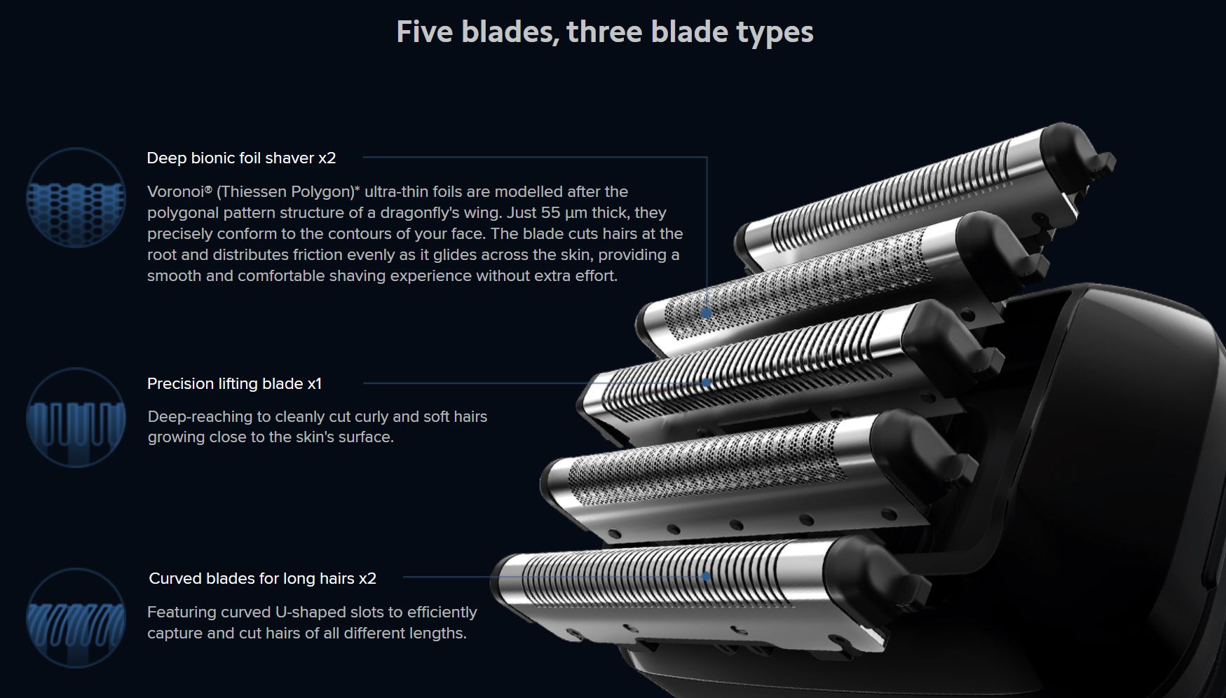 - - ใบมีดมี 5 หัว 3 แบบ ได้แก่ ใบมีดตาข่าย 2 ใบ/ ใบมีดแบบซี่หวี 1 ใบ/ ใบมีดเคียวโค้ง 2 ใบ