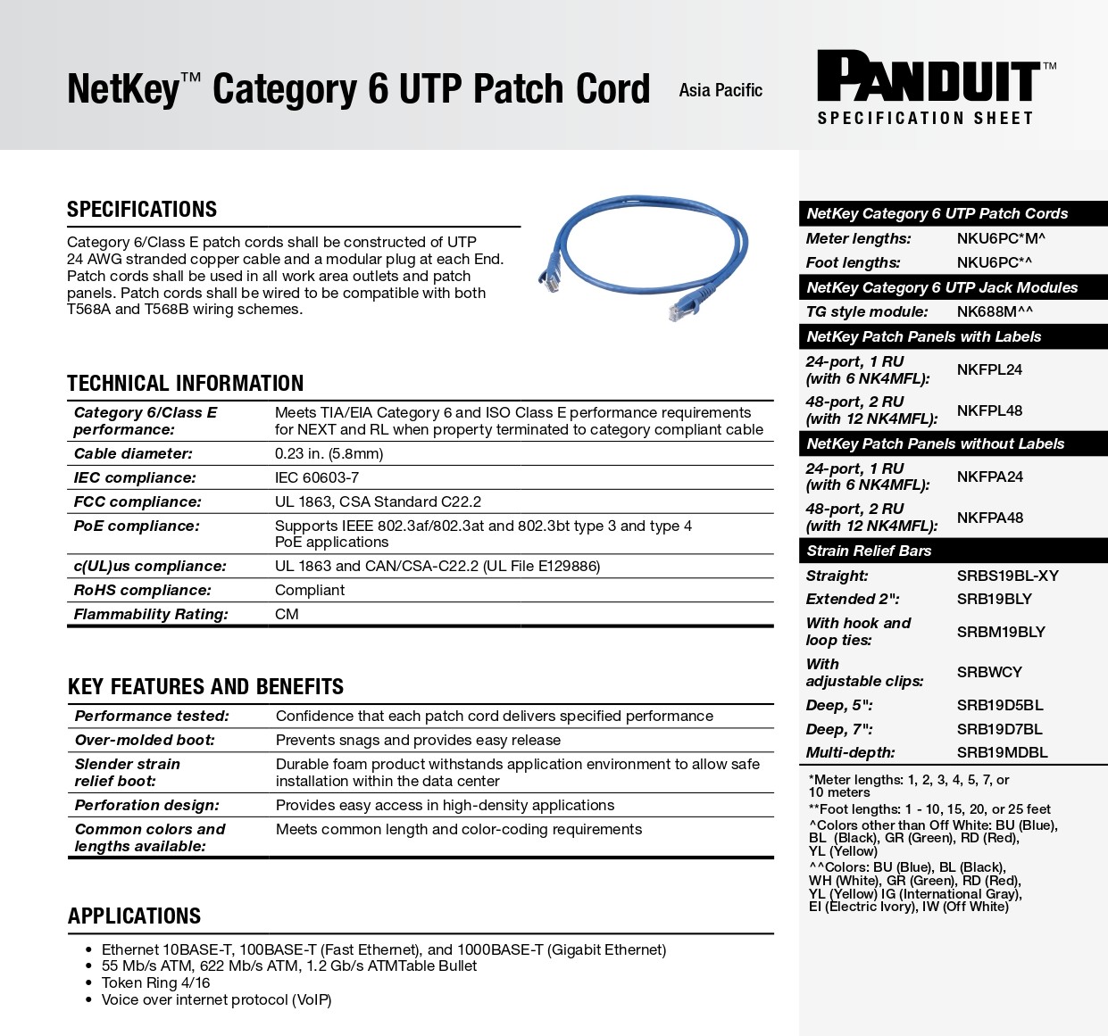 Panduit Netkey NKU6PC2MBU CAT6 Indoor UTP Copper Patch Cord Category 2M สายแลน