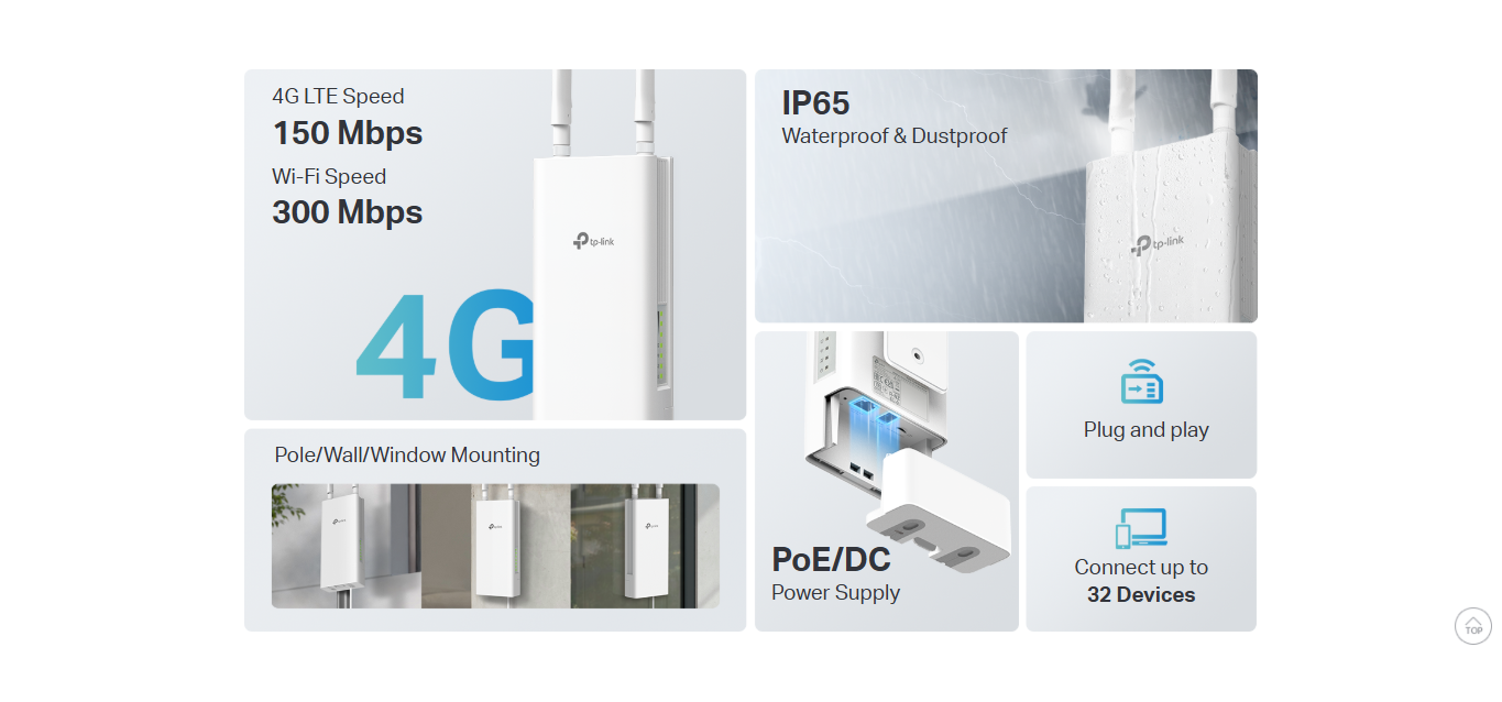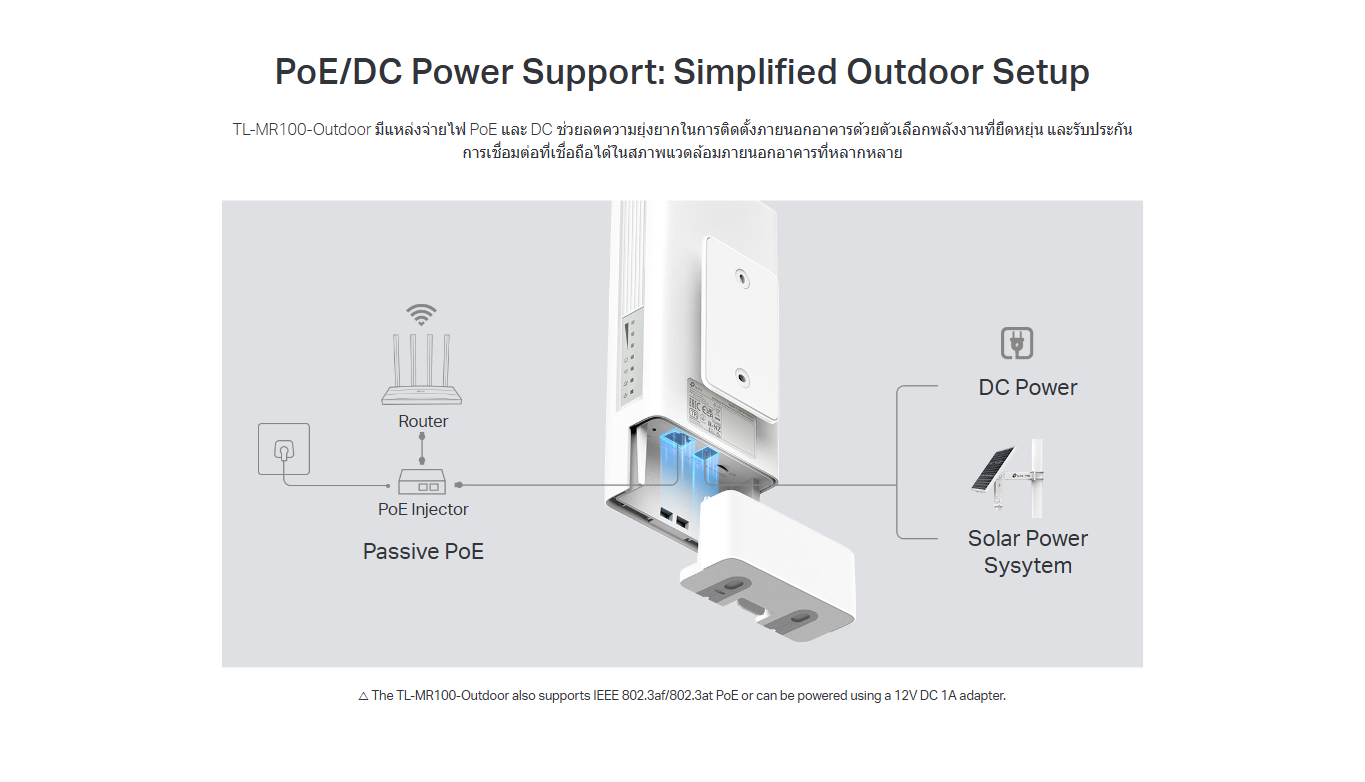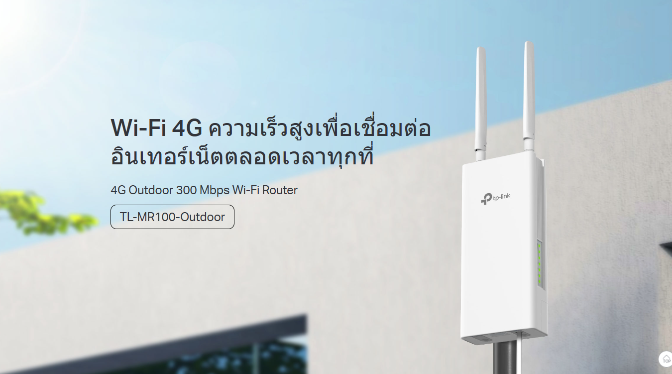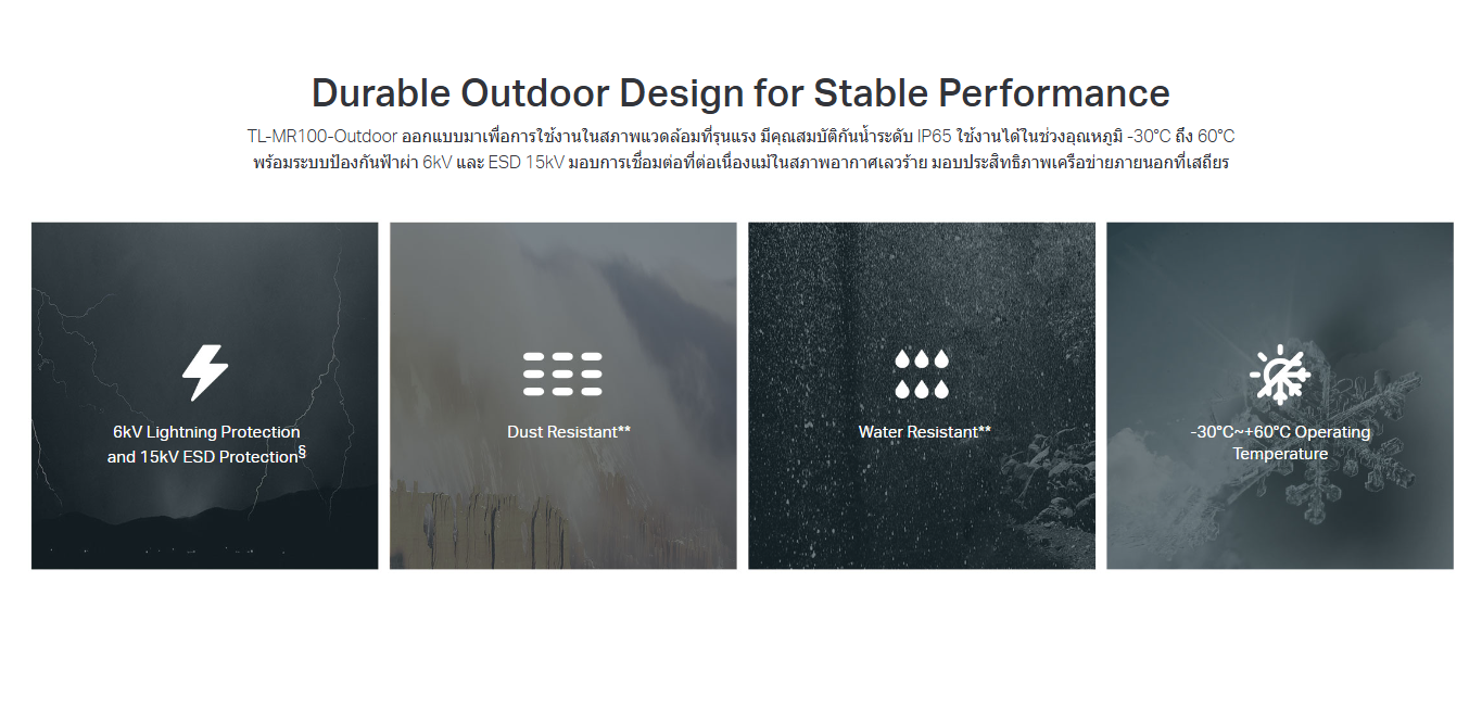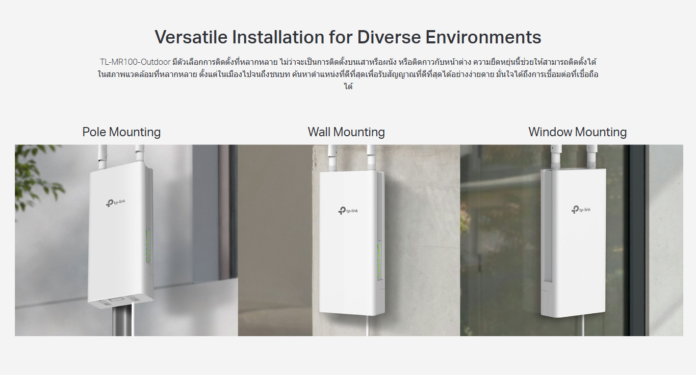TP-Link TL-MR100-Outdoor คือเราเตอร์ 4G Wi-Fi ภายนอกอาคาร ที่ให้ความเร็ว LTE สูงสุด 150 Mbps และ Wi-Fi 300 Mbps บนคลื่น 2.4GHz ตัวเครื่องทนทานต่อสภาพอากาศระดับ IP65 พร้อมระบบป้องกันฟ้าผ่าและไฟฟ้าสถิต ติดตั้งได้หลากหลายทั้งบนเสา ผนัง หรือหน้าต่าง ใช้งานง่ายแบบ Plug and Play รองรับ PoE และตั้งค่าง่ายผ่านแอป Tether เหมาะสำหรับบ้านหรือพื้นที่ห่างไกล