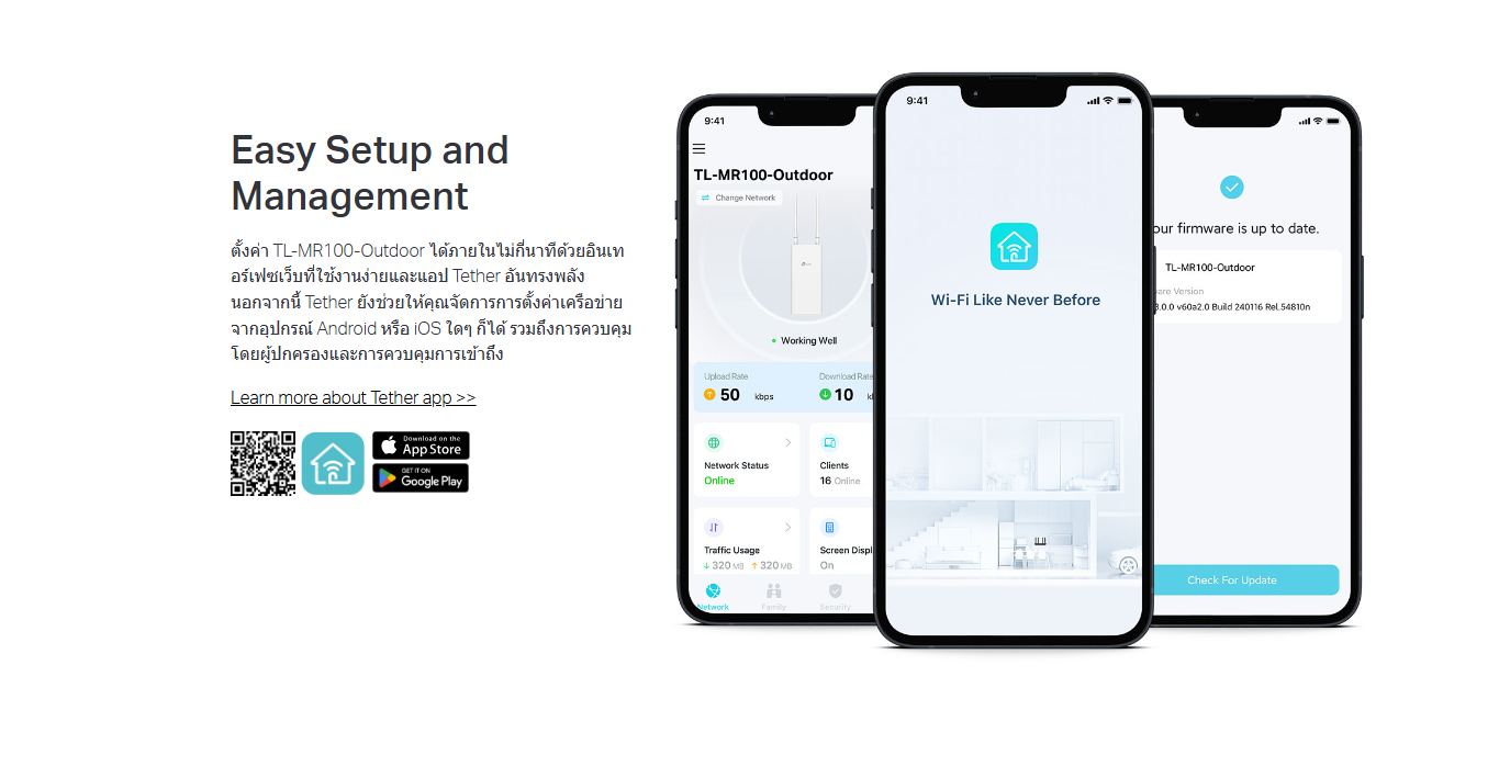 - - Simplified Setup : ตั้งค่าและจัดการเครือข่ายของคุณได้ง่ายผ่านแอป Tether