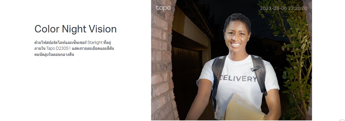- - Color Night Vision : ด้วยไฟสปอร์ตไลท์และเซ็นเซอร์ Starlight ที่อยู่ภายใน Tapo D230S1 แสดงรายละเอียดและสีสันคมชัดสูงในตอนกลางคืน