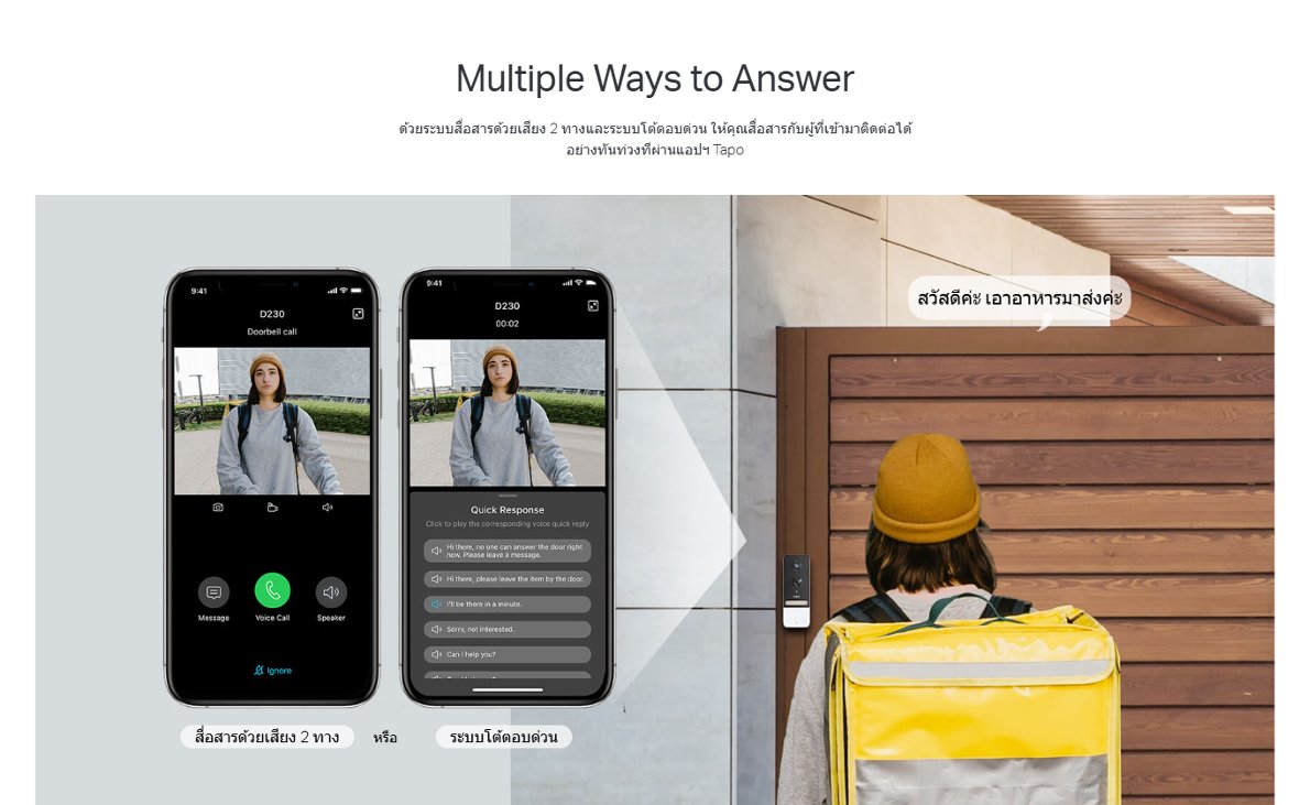 - - Multiple Ways to Answer : ด้วยระบบสื่อสารด้วยเสียง 2 ทางและระบบโต้ตอบด่วน ให้คุณสื่อสารกับผู้ที่เข้ามาติดต่อได้อย่างทันท่วงทีผ่านแอปฯ Tapo