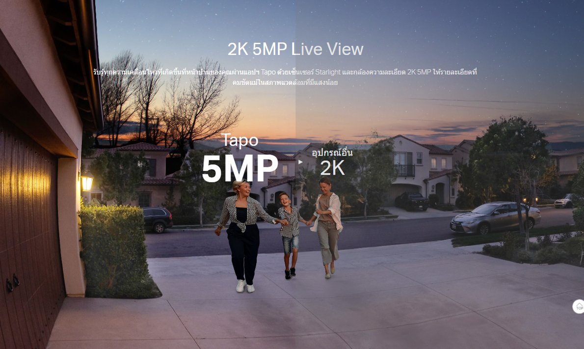 - - 2K 5MP Live View : รับรู้ทุกความเคลื่อนไหวที่เกิดขึ้นที่หน้าบ้านของคุณผ่านแอปฯ Tapo ด้วยเซ็นเซอร์ Starlight และกล้องความละเอียด 2K 5MP ให้รายละเอียดที่คมชัดแม้ในสภาพแวดล้อมที่มีแสงน้อย