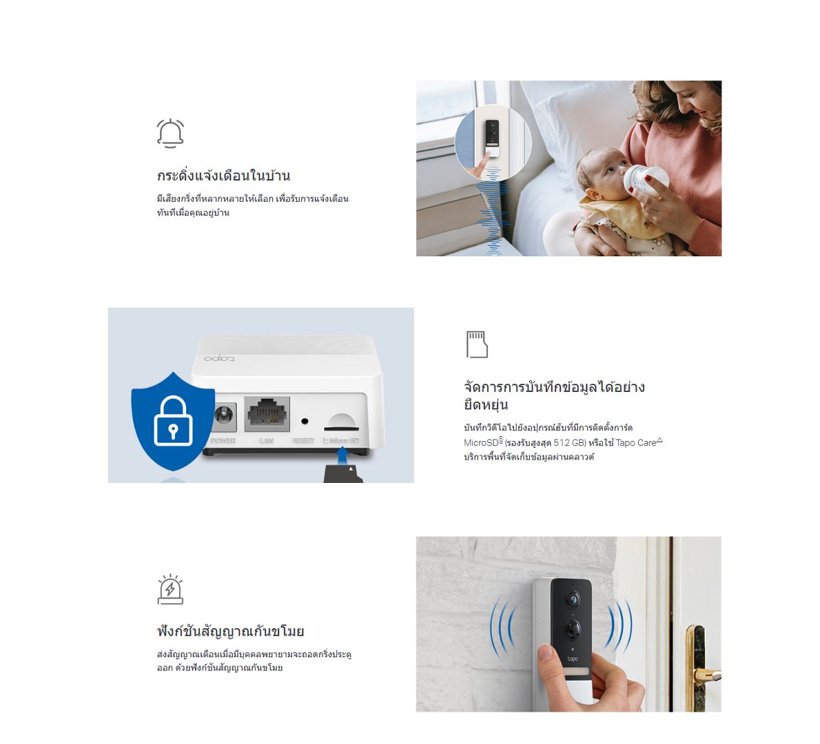 - - Flexible Storage Choice : บันทึกวิดีโอไปยังอปุกรณ์ Tapo ฮับที่มีการติดตั้งการ์ด MicroSD (รองรับสูงสุด 512 GB) หรือใช้ Tapo Care บริการพื้นที่จัดเก็บข้อมูลผ่านคลาวด์
