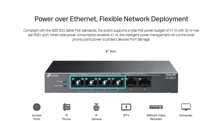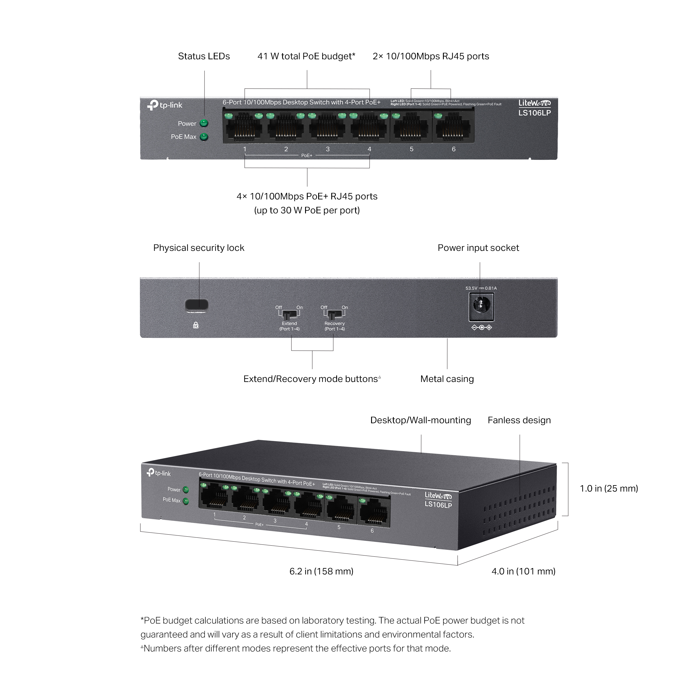 - - 6× 10/100 Mbps RJ45 Ports (4× 10/100 Mbps 802.3af/at PoE+ Ports)