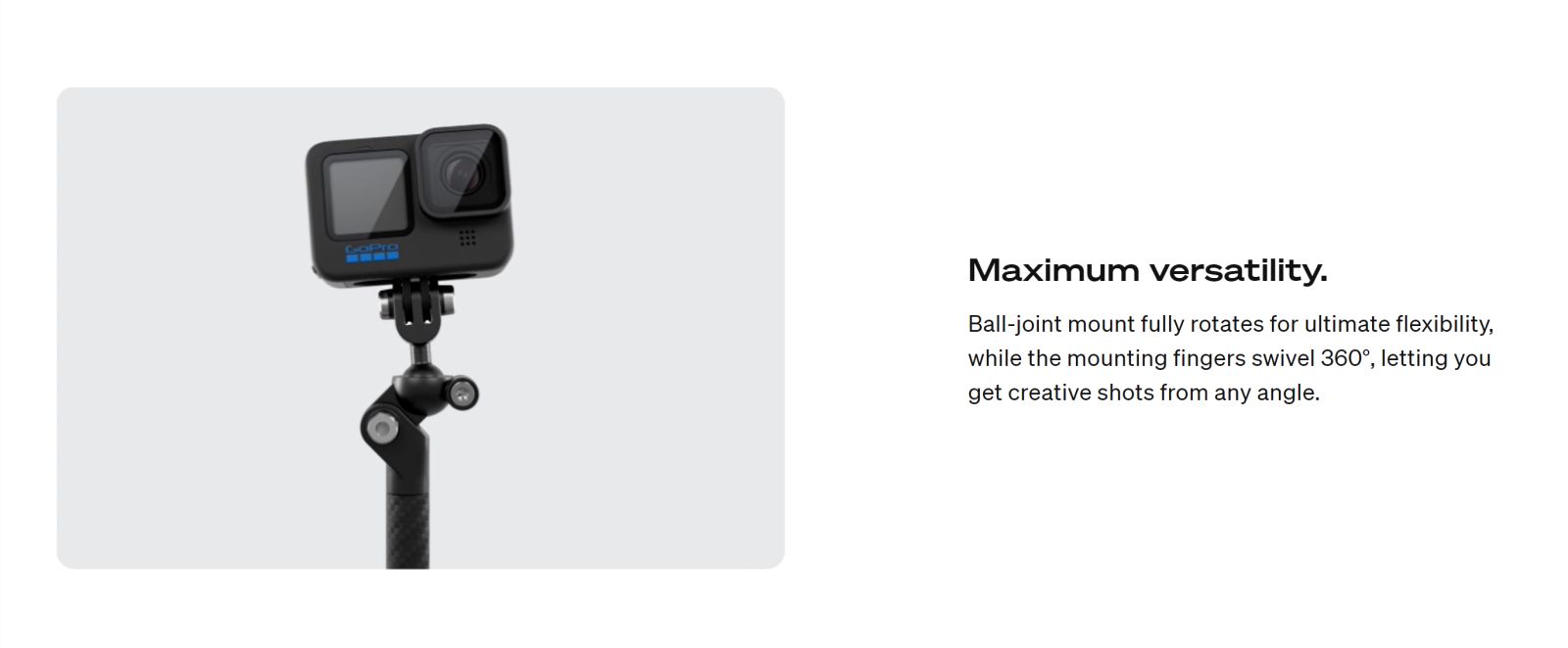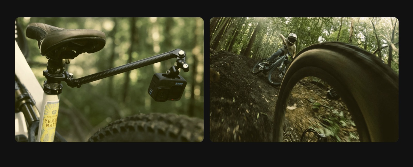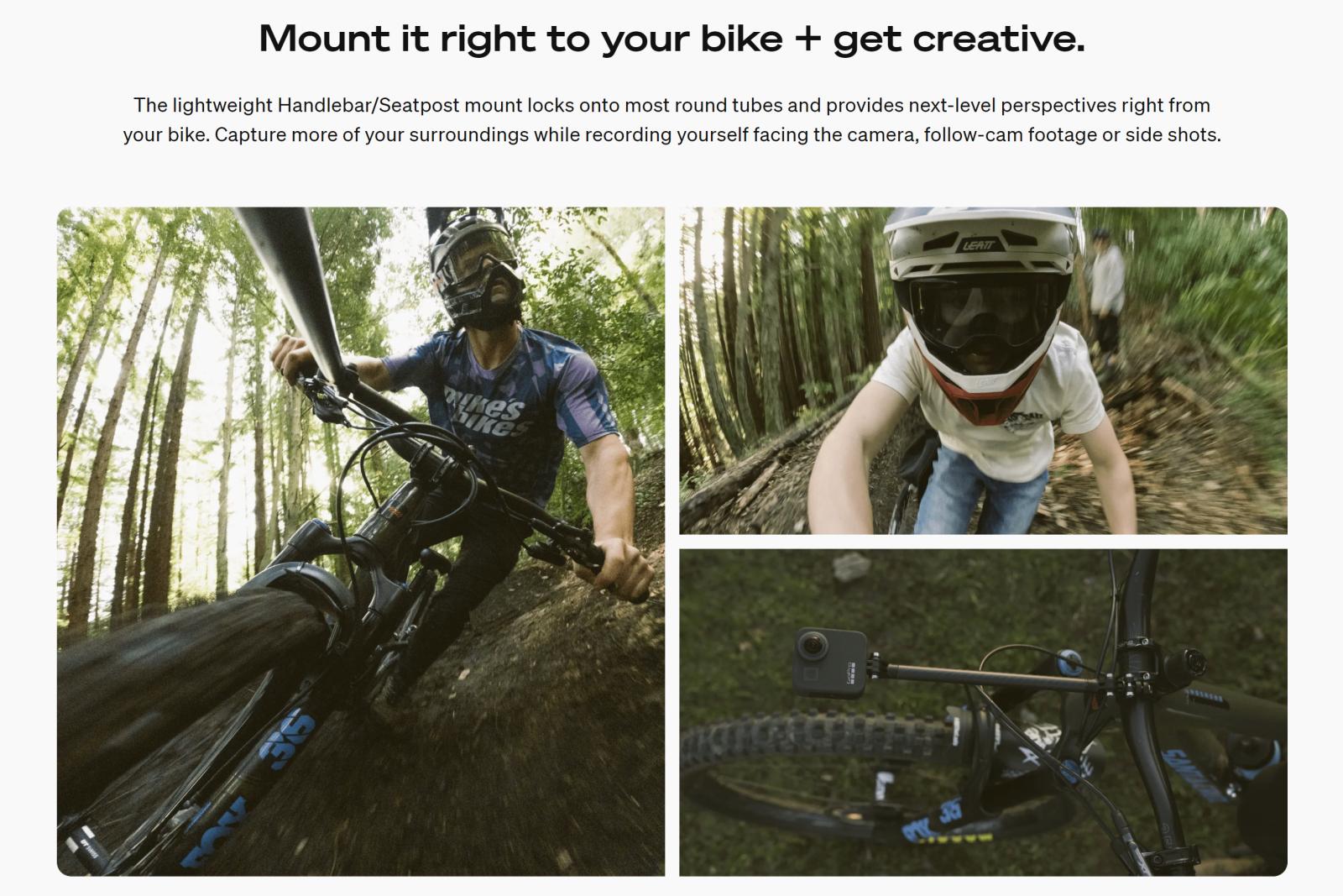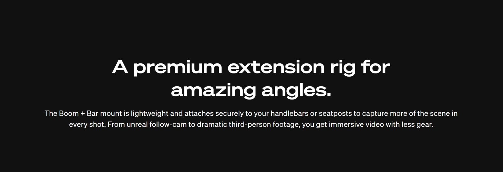 ขาตั้งกล้อง Boom + Bar Mount มีแขนต่อขยายทำจากคาร์บอนไฟเบอร์ที่สามารถติดตั้งเข้ากับแฮนด์จักรยานและหลักอานทรงกลมส่วนใหญ่ได้อย่างง่ายดาย เพื่อให้ได้ภาพมุมกว้างของตัวคุณที่หันหน้าเข้ากล้อง ภาพติดตาม หรือภาพด้านข้างของคุณขณะปั่นจักรยาน