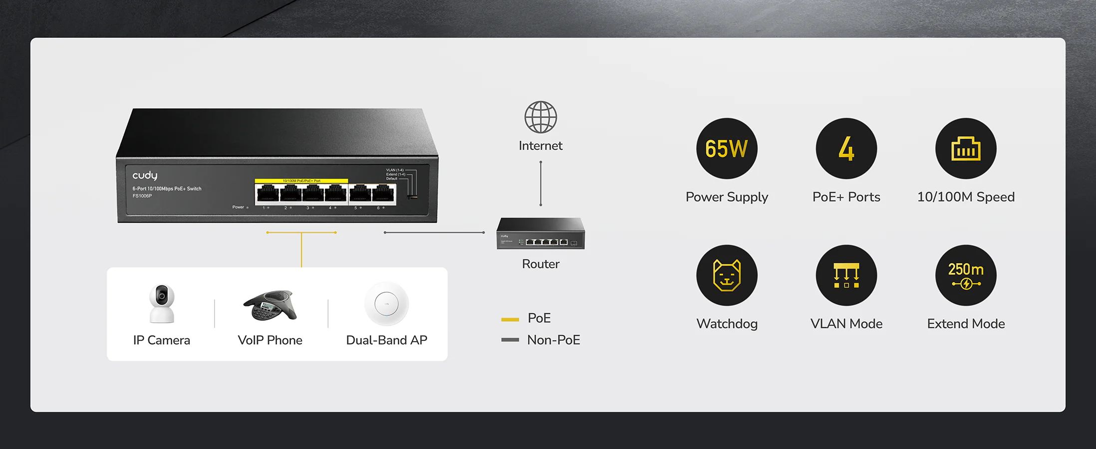 Cudy FS1006P 4-Port 2 Uplink 10/100 Mbps PoE+ Switch 65W สวิตช์ PoE