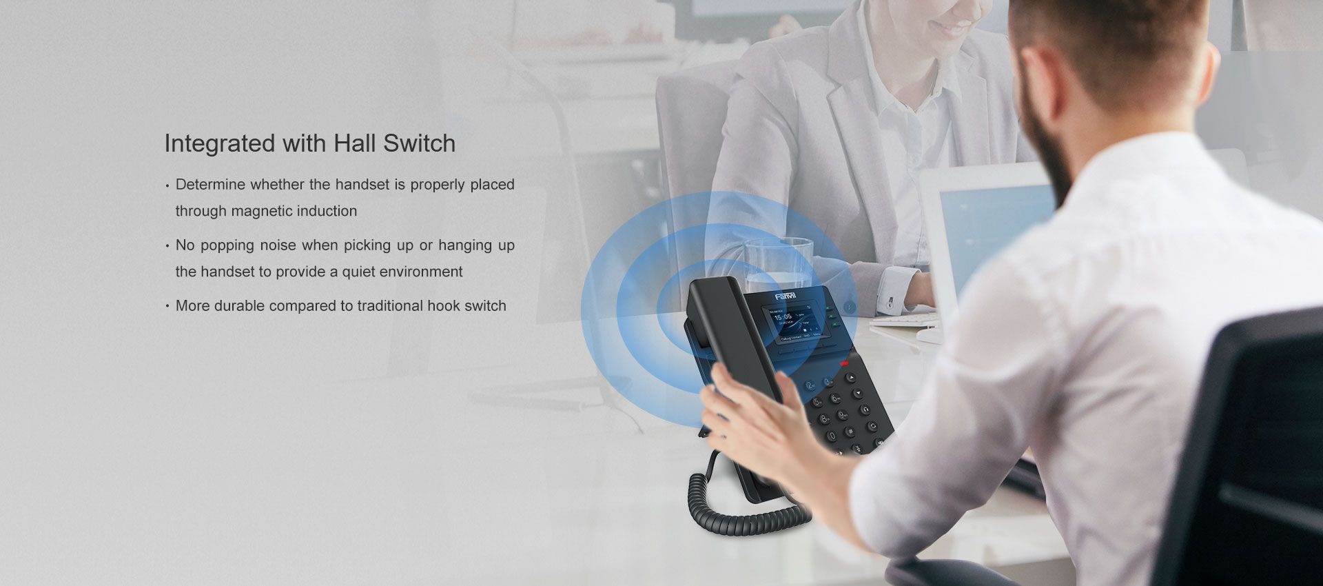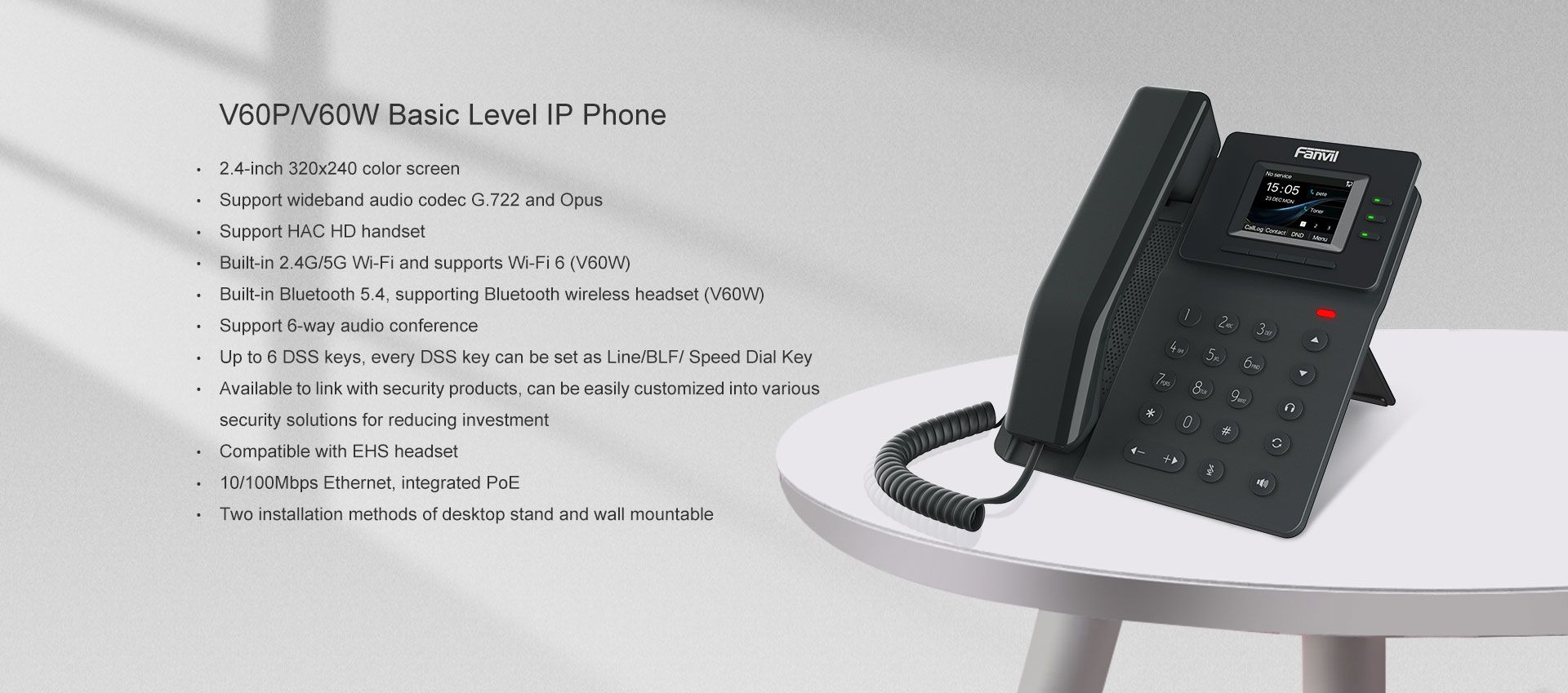 Fanvil V60P IP Phone ที่เหมาะสำหรับการใช้งานในสำนักงานทั่วไป รองรับ SIP 4 คู่สาย, หน้าจอสีขนาด 2.4 นิ้ว, ลำโพงและหูฟังแบบ HD Voice, ประชุมสายได้สูงสุด 6 สาย พร้อมพอร์ต Ethernet 10/100Mbps และฟังก์ชัน PoE ในตัว ติดตั้งได้ทั้งตั้งโต๊ะและติดผนัง